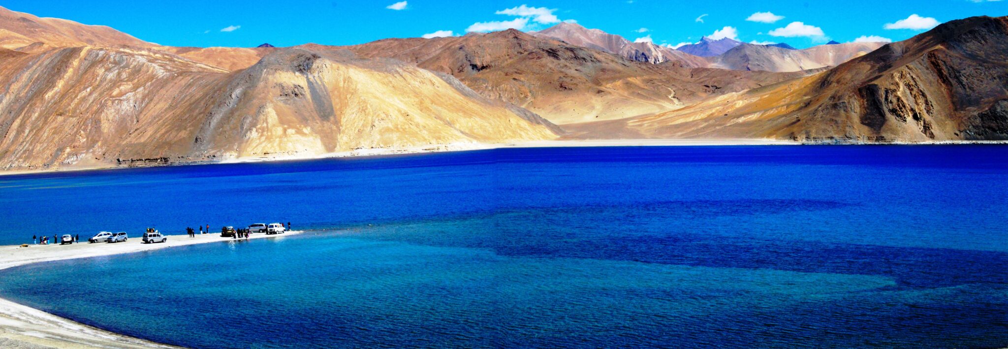 Pangong Lake – Is an natural lake in the great Himalayas situated at a height of about 4,350 Mtrs (14,270 ft). It is 134 kms long and extends from India to Tibet [CHINA]. Approximately 50% of the length of the lake lies in Tibet [China]. The lake is 5 km (3.1 mi) wide at its broadest point. All together it covers 604 km. During winter the lake completely freezes.